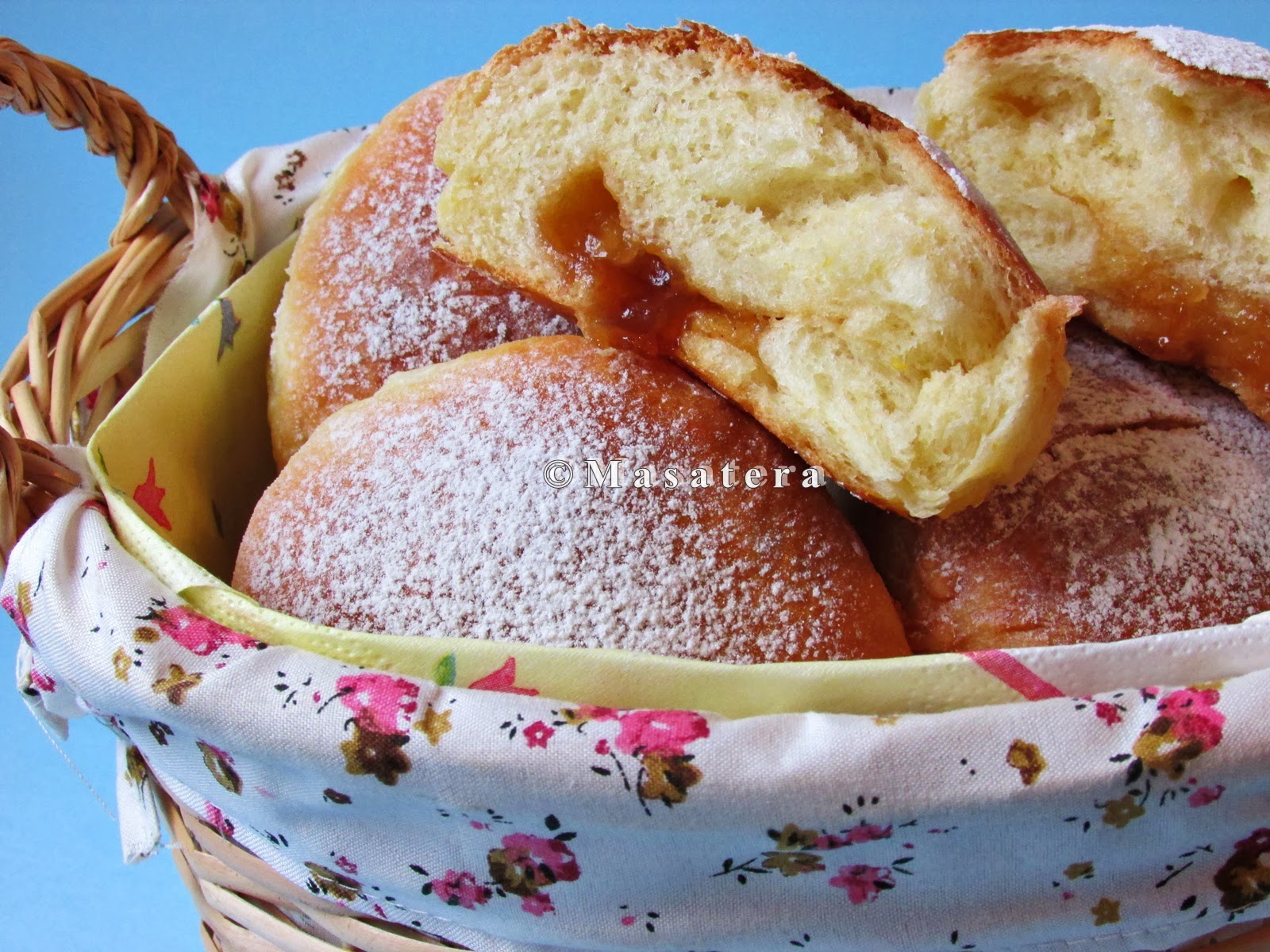 Naraslo tijesto premijesiti i odrezati na 12 dijelova. Svaki dio posebno malo premijesiti kako bi vanjski dio ostao gladak. Rastanjiti svaku lopticu u krug, puniti marmeladom ili čokoladom i dobro zatvoriti (vidi sliku). Spojeni dio tijesta kugle staviti s donje strane na tepsiju obloženu papirom za pečenje.